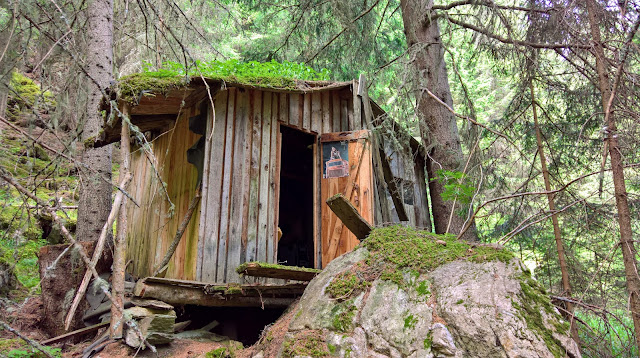 Je komt dan al na enkele tientallen meters deze vervallen hut tegen.